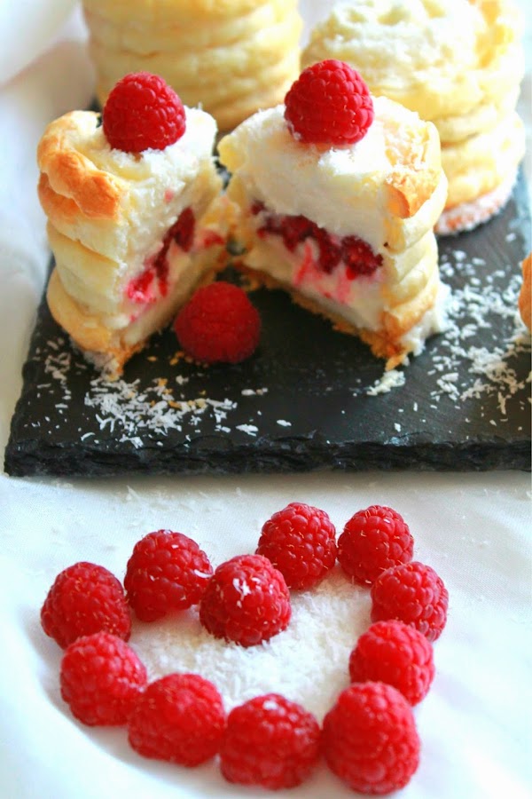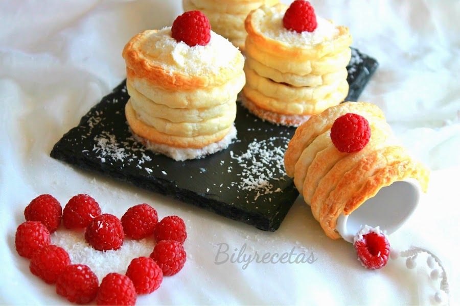Pasamos los literales de las galletas por la crema y rebozamos con coco rallado (opcional). Las colocamos en una superficie plana o la bandeja donde vamos a refrigerar los pastelitos. Colocamos encima los cilindros de hojaldre y aplicamos una primera capa de crema. Cubrimos con frambuesas y volvemos a depositar crema. Por encima he espolvoreado también un poco de coco rallado y he decorado con el resto de frambuesas. Se conservan en la nevera hasta la consumición.