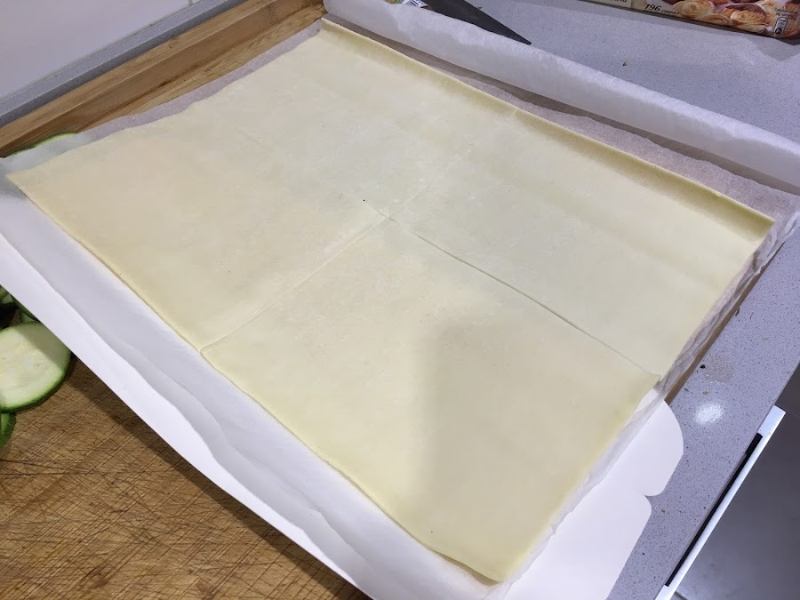 1.Precalentamos el horno a 200ºC. Dividimos la plancha de hojaldre en cuatro partes iguales. Colocamos sobre dos de ellas las otras dos planchas, de esta forma conseguiremos que el hojaldre tome más volumen al hornearlo.