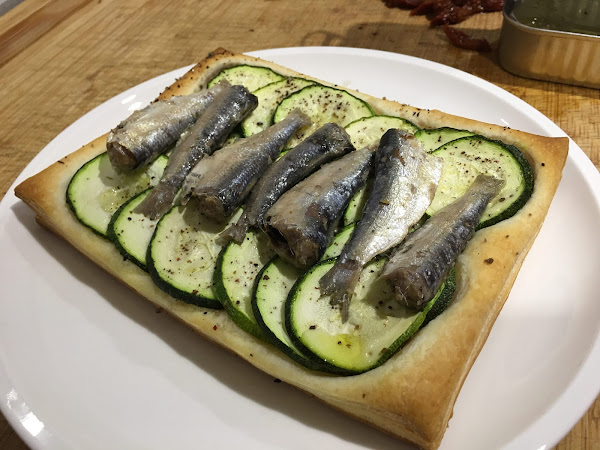 3. Una vez horneado lo sacamos del horno. Abrimos nuestra lata de sardinillas Herpac de yaentucasa y escurrimos. Colocamos estratégicamente en fila en el centro del hojaldre.