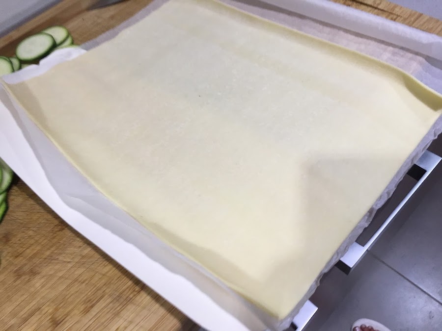 2. Lavamos y laminamos con la mandolina el calabacín, debe ser bien finito. Cubrimos el centro del hojaldre con las láminas del calabacín. Poner medio calabacín para cada hojaldre. Yo he colocado tres filas bien tupidas, salpimentamos con la flor de sal picante de Soso Factory y ponemos un chorrito de aceite virgen extra. Al hacerse en el horno pierde su agua y su volumen, así que aunque parezca demasiado, al hornearlo queda perfecto. Horneamos durante 25 minutos a 200ºC.
