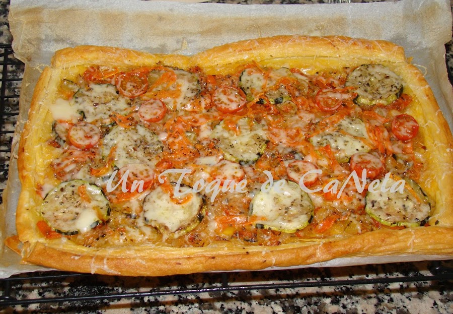 Extender sobre la base del hojaldre la cebolla y colocar encima, al gusto, el calabacín y las berenjenas.