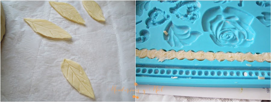 Con los recortes que te han sobrado del hojaldre haz unos dibujos, yo he hecho unas hojitas y una tira de bolitas con un molde de foundant, pero puedes darle la forma que más te guste.