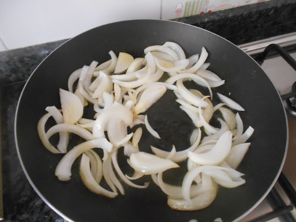 Cortamos la cebolla en juliana y pochamos en una sarten con aceite.