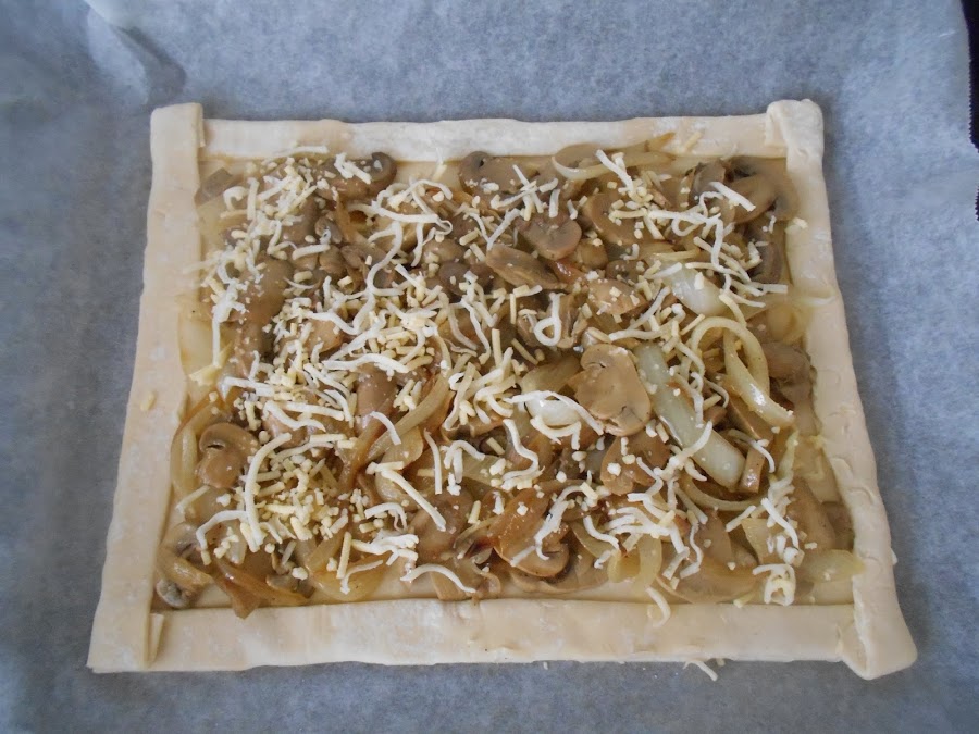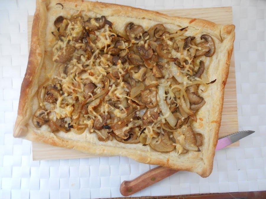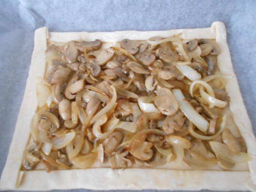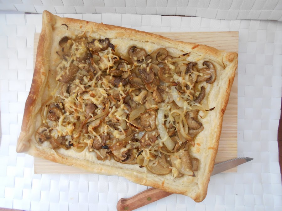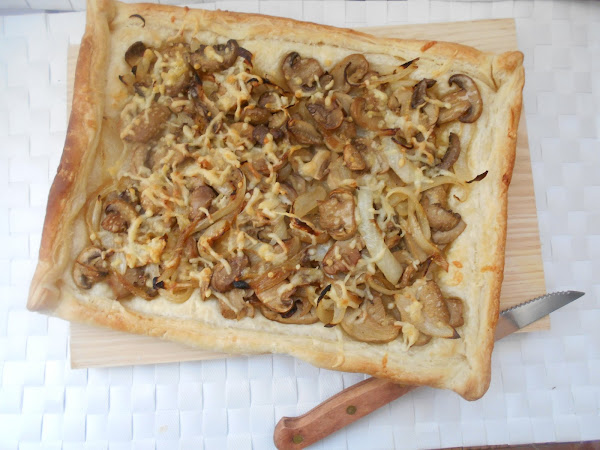 Hoy una receta de hojaldre facil y rapida. Con cebolla y champiñones es apta (sin el queso) para vegetarianos.