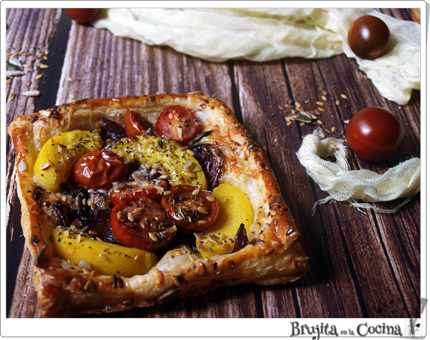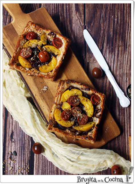 Preparamos el hojaldre, cortamos en 4 y pinchamos con un tenedor en el centro, doblamos los bordes para que tengan como 15 o 2 cm. Espolvoreamos los quesos rallados cubriendo la base. Cubrimos con la cebolla caramelizada y distribuimos los cherrys cortados a la mitad y gajos de melocotón. Pincelamos con huevo batido y espolvoreamos semillas al gusto.