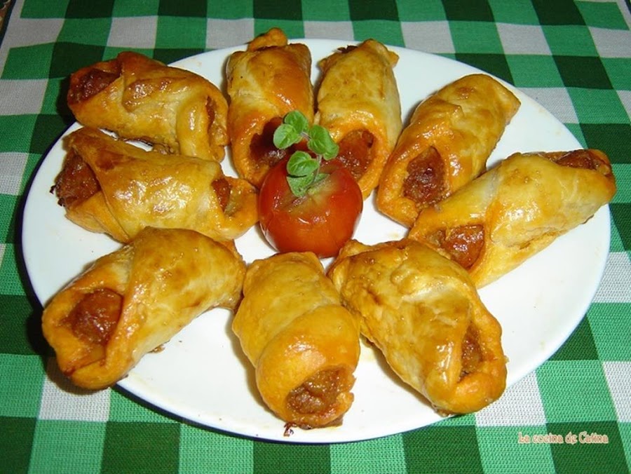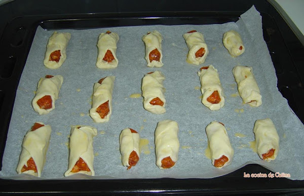 Colocar en cada trozo de hojaldre uno de chistorra, plegar el hojaldre envolviendo la chistorra y pincharlo en el cierre.