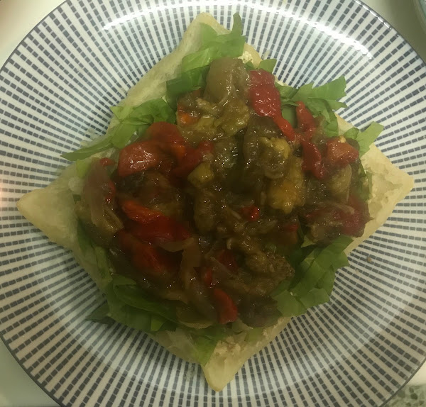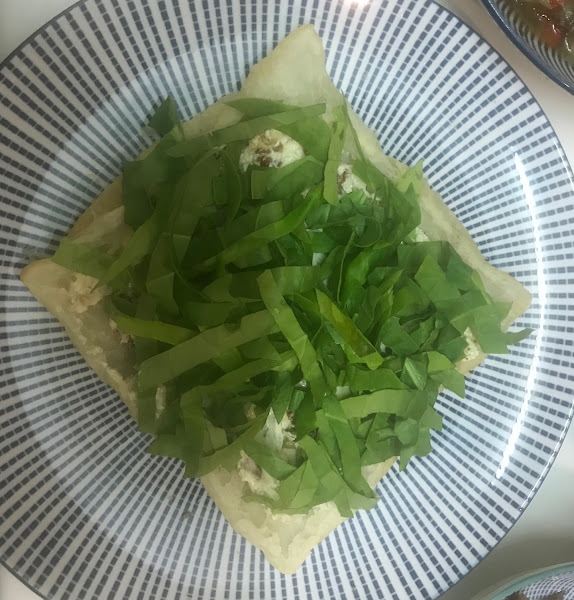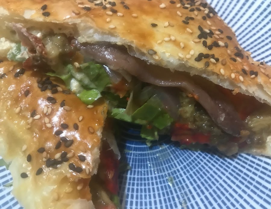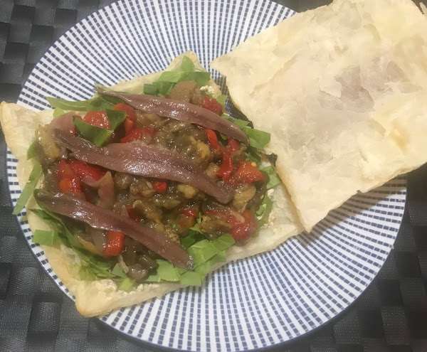 Esta receta es especial, es como un bocadillo de lujo, la mezcla de sabores no te puede dejar indiferente, puedes cambiar la escalibada por cualquier verdura asada y aunque nosotros lo hemos comido frío, caliente tambien debe estar bien rico, espero que te guste y si haces la receta ya me contarás.