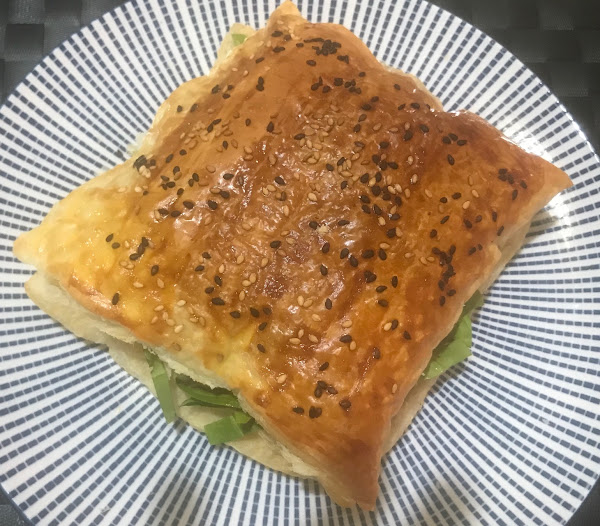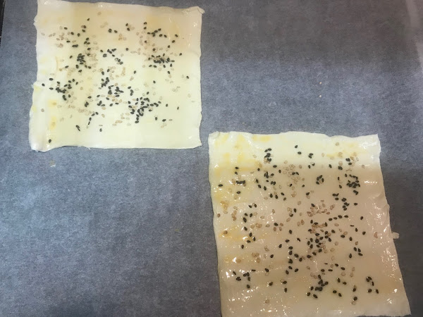 Lo primero que haremos es precalentar el horno a 180º, preparamos el hojaldre cortando la media masa de hojaldre por la mitad, pintas con el huevo batido y espolvoreas con las semillas, reserva hasta que esté el horno caliente.