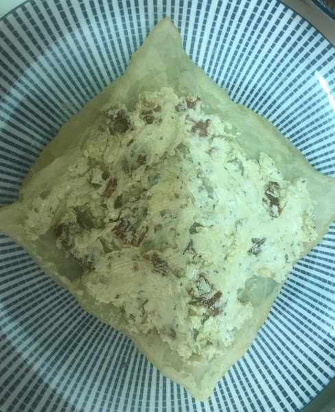 Hornea el hojaldre unos 15 min o hasta que esté dorado, deja enfriar y abre por la mitad, unta la mezcla de queso,
