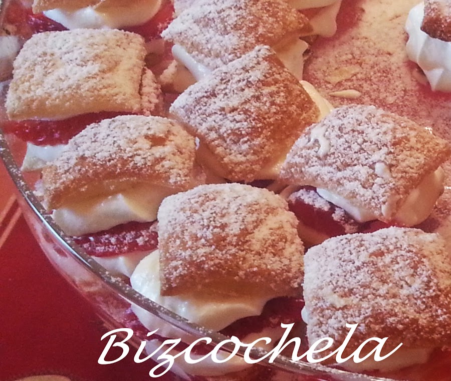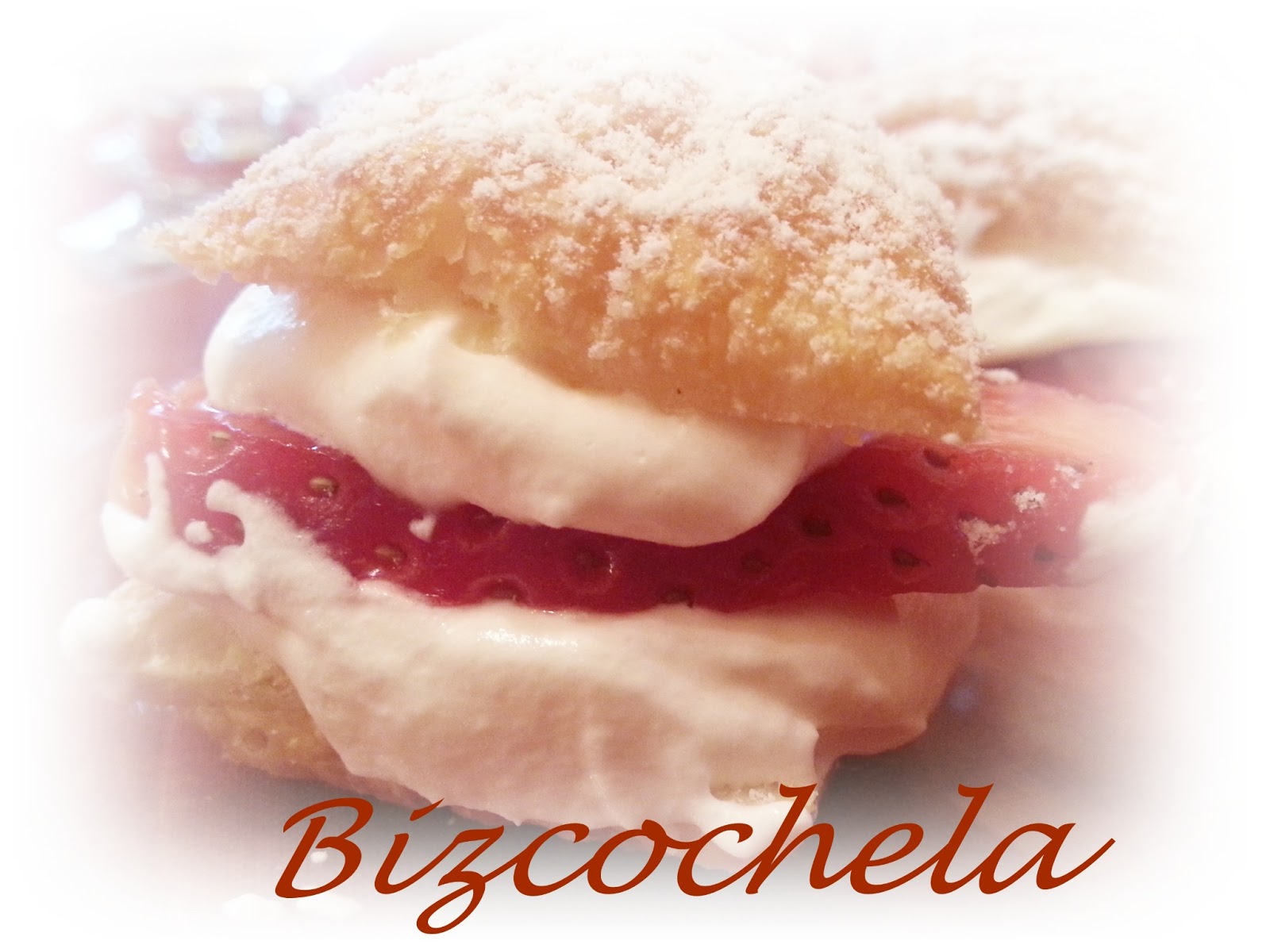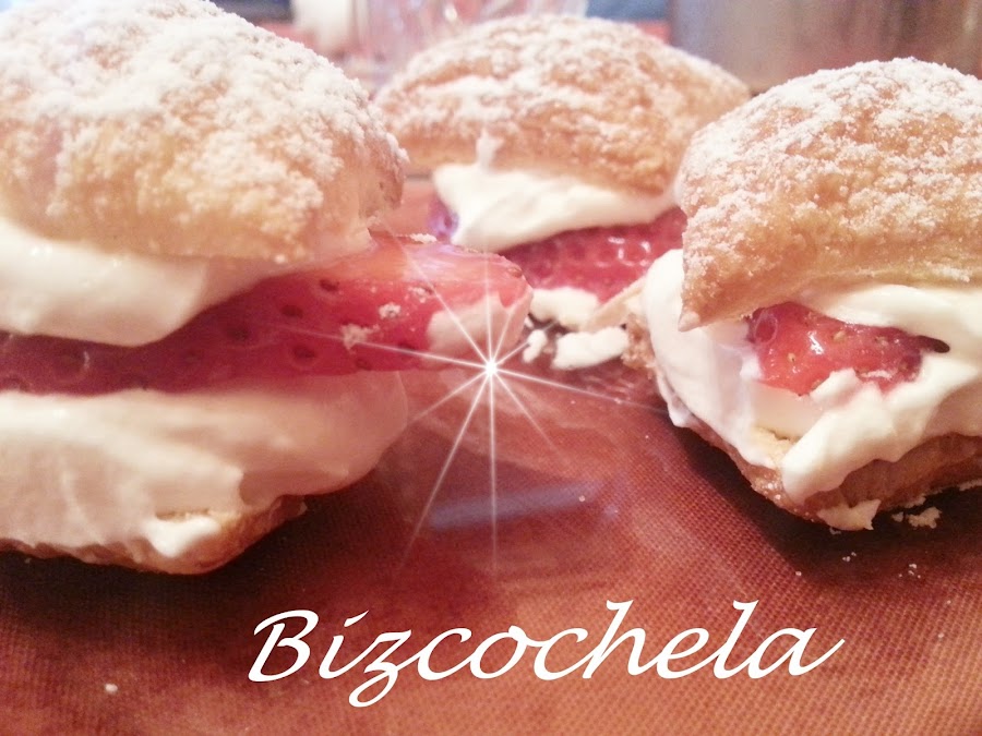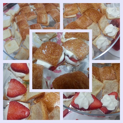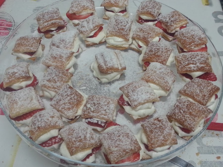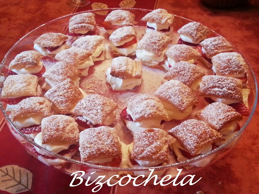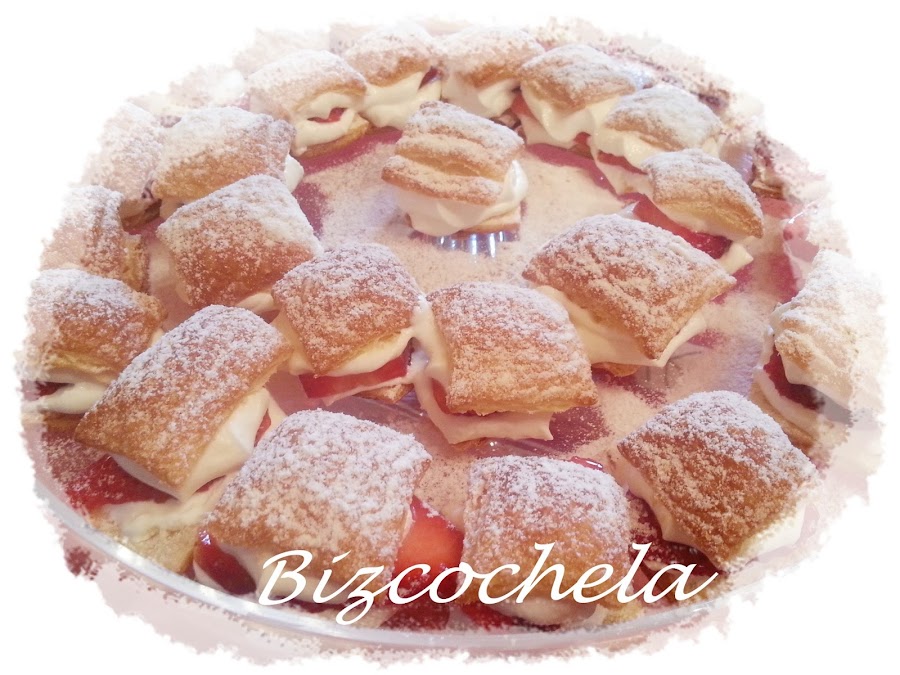 6. - Y empieza el montaje: En una manga ponemos la nata (crema de leche), o si no tenéis manga, con una cucharita vais depositando un poco de nata (crema de leche) en cada hojaldrito. Luego ponemos una rodaja de fresa y volvemos a poner nata (crema de leche) y tapamos.