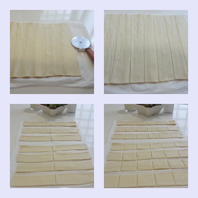 1. - En primer lugar encendemos el horno a 200º. Mientras extendemos la lámina de hojaldre y con un cortapizza hacemos cortes del tamaño deseado.