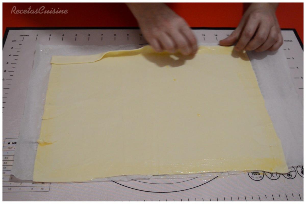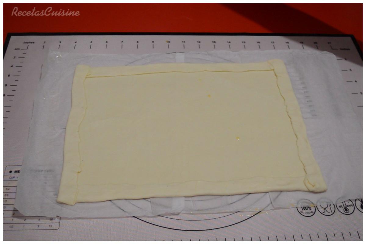 1. Estiramos la lámina de hojaldre en nuestra superficie de trabajo y damos unas pasadas con el rodillo.
