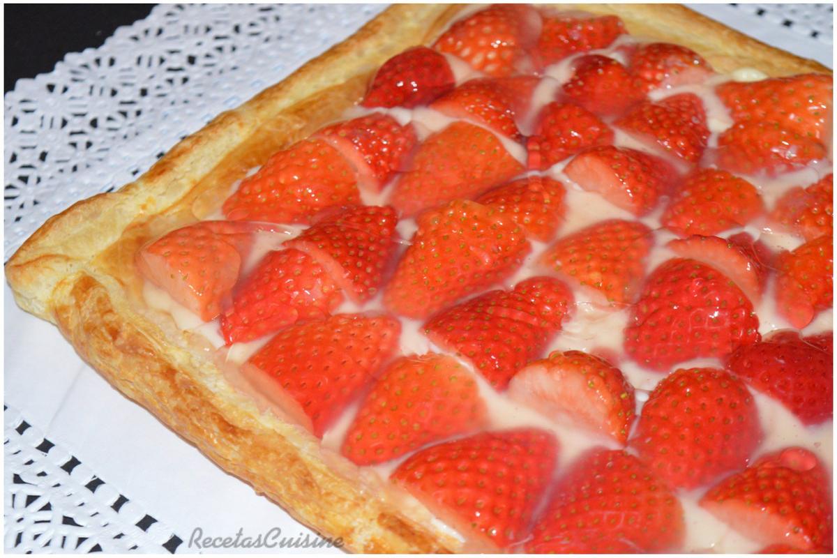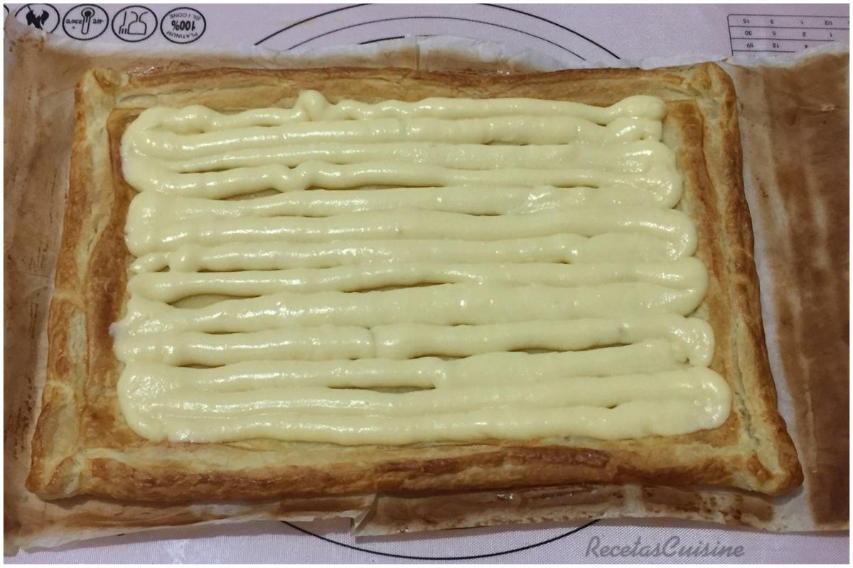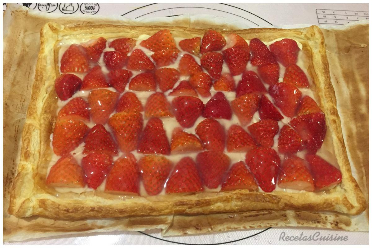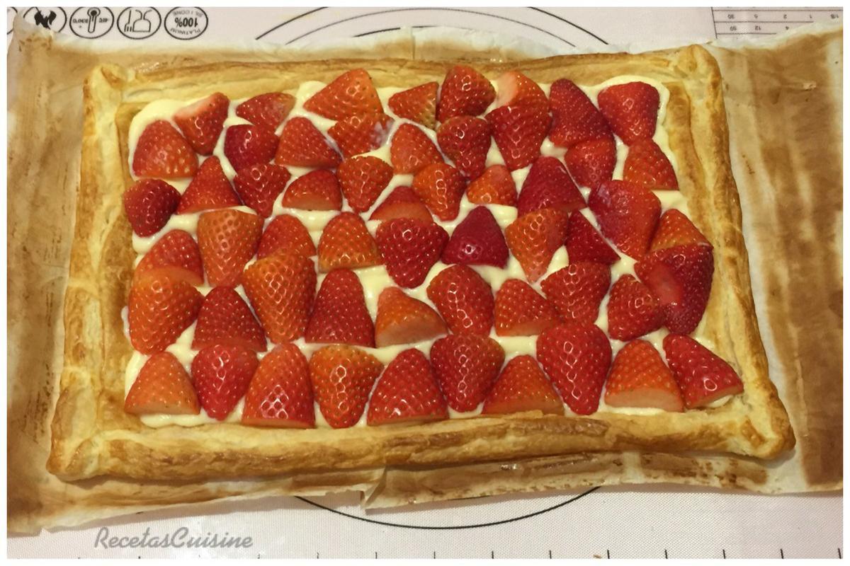 5. Cuando el hojaldre esté frío, cubrimos con la crema pastelera y encima de la crema, colocaremos las fresas que tendremos partidas por la mitad. Si lo prefería, se pueden poner las fresas laminadas en lugar de partidas a la mitad.