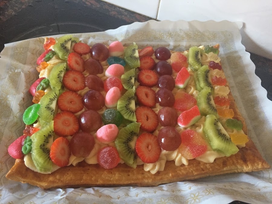 Rellenar el hojaldre con la crema pastelera y decorar con las frutas y chucherias