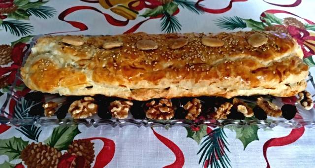 Desenrollar la masa de hojaldre, extender la mezcla por la superficie y formar un rollo.