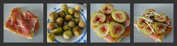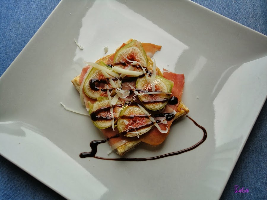Colocamos las láminas de higo sobre el jamón, unas 4/5 láminas por cada tosta de hojaldre.