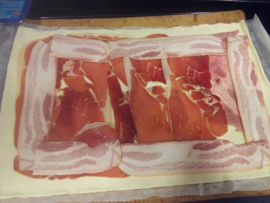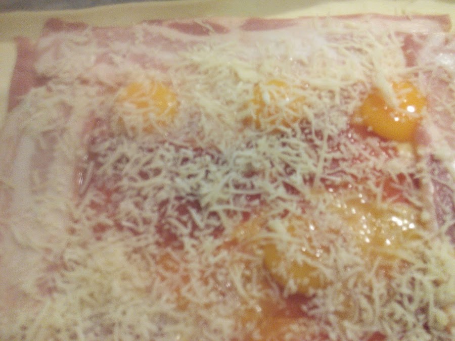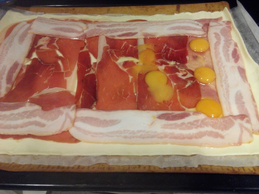 Ingredientes: una lámina de hojaldre 4 lonchas de jamón serrano 5 lonchas de bacon 12 huevos de codorniz queso rallado