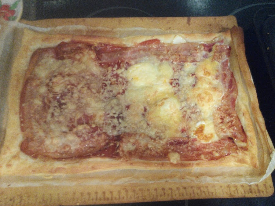 Preparación: 1.- Precalentamos el horno a 210º. 2.- Extendemos la lámina de hojaldre sobre una bandeja de horno y colocamos todos los ingredientes. 3.- Espolvoreamos con queso rallado y al horno de 10 a 15 minutos, por arriba y por abajo a 210º.