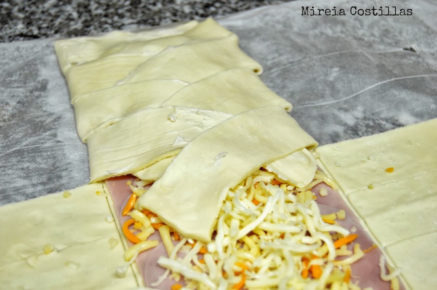 4. En las dos franjas de masa de hojaldre que quedan a los dos lados se hacen cortes paralelos a lo largo de cada una, como se ve en las fotos, y estos cortes se van doblando sobre el relleno central, haciendo ese diseño. Sellar un poco los bordes.
