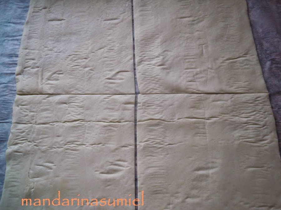 Corta la lámina de hojaldre en cuadrados, hazlos del tamaño que tu quieras.