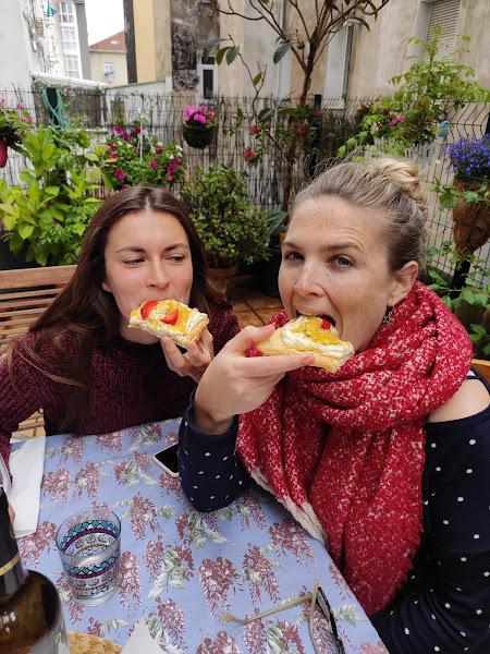 Batimos el mascarpone con la nata (crema de leche) y 3 cucharadas de lemon curd hasta conseguir una pasta que se pueda untar y esparcir bien por encima del hojaldre. Lo volcamos en el centro y vamos repartiendo untando por encima hasta cubrir el hojaldre. Ahora con las otras 3 cucharadas de lemon curd que tenemos reservadas lo decoramos por encima, añadimos unas fresas para darlo color y por encima los pistachos triturados.