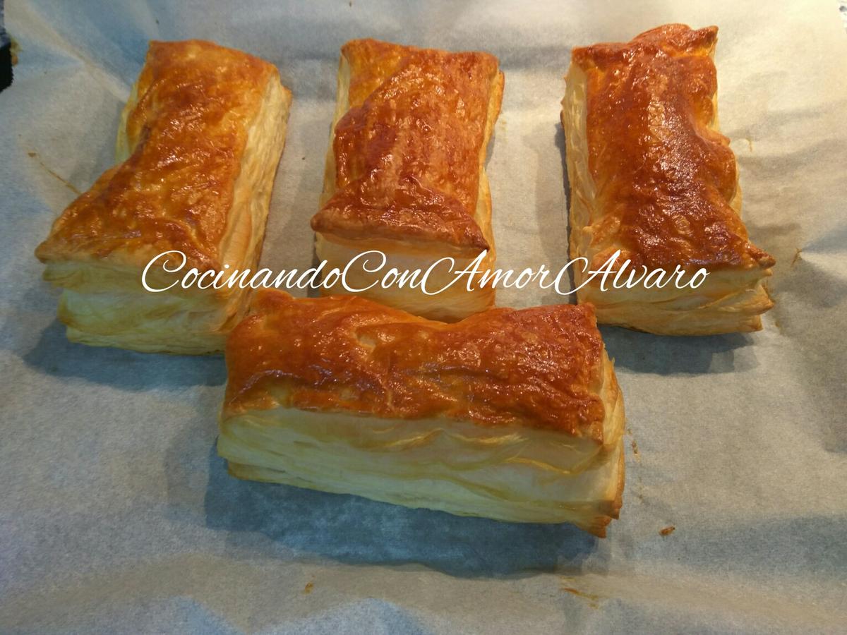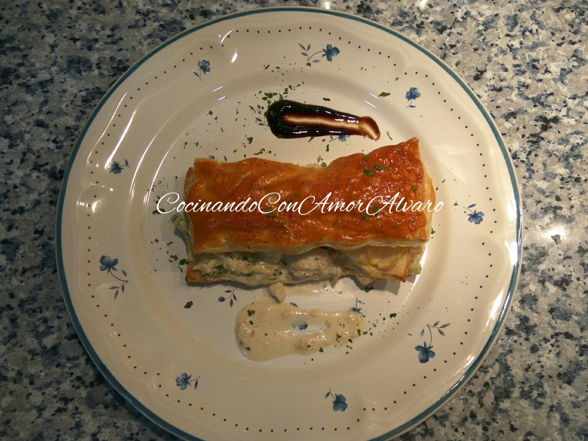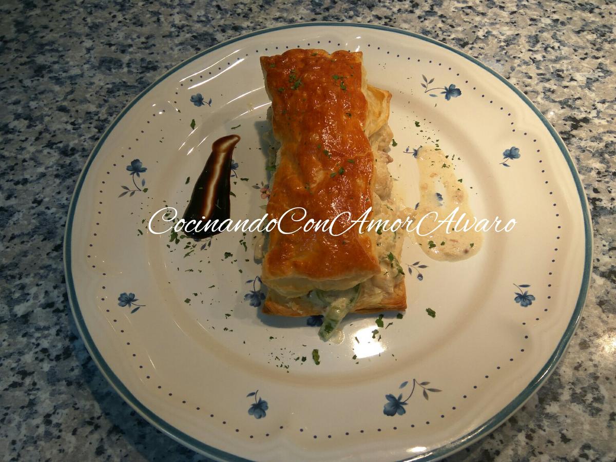 Yo lo rellené de merluza, y van con Verduras a la juliana con nata (crema de leche) líquida de cocinar. Las laminas de hojaldre, las podréis comprar en cualquier supermercado o centro comercial.