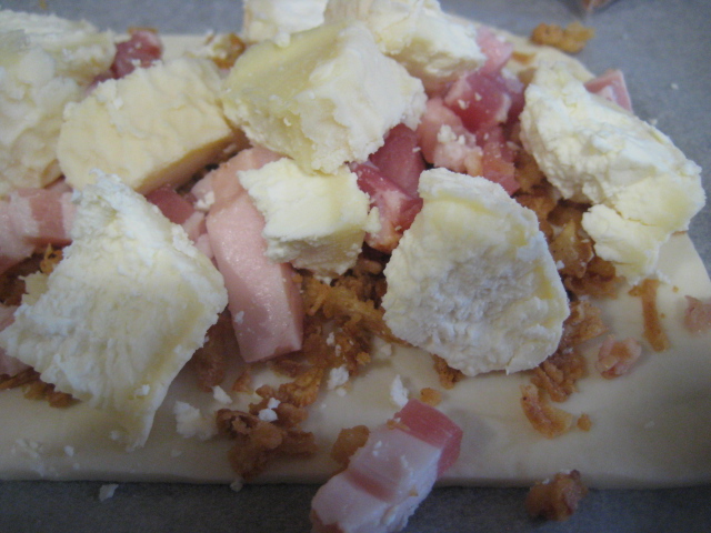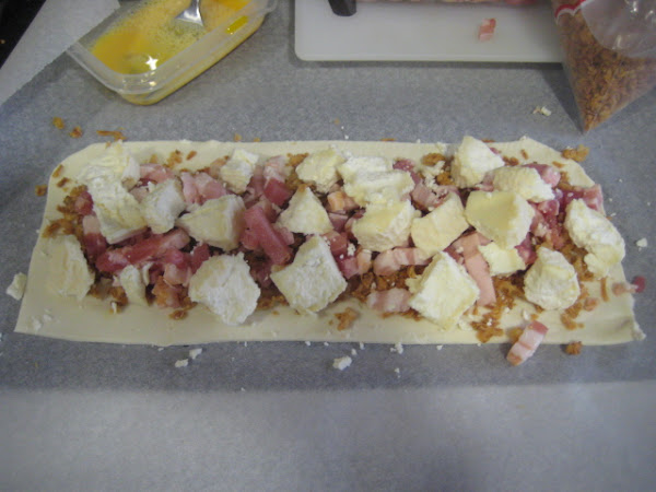 HOJALDRE DE QUESO DE CABRA, CEBOLLA CRUJIENTE Y BACONIngredientes para 6 personas: