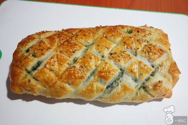 4. Envolvemos como si fuera un pañuelo y le damos la vuelta. Con un cuchillo bien afilado hacemos corte en direcciones contrarias. También unos cortes transversales que nos servirán de guía para cortar las futuras porciones. Pintamos con huevo batido y espolvoreamos sésamo tostado.