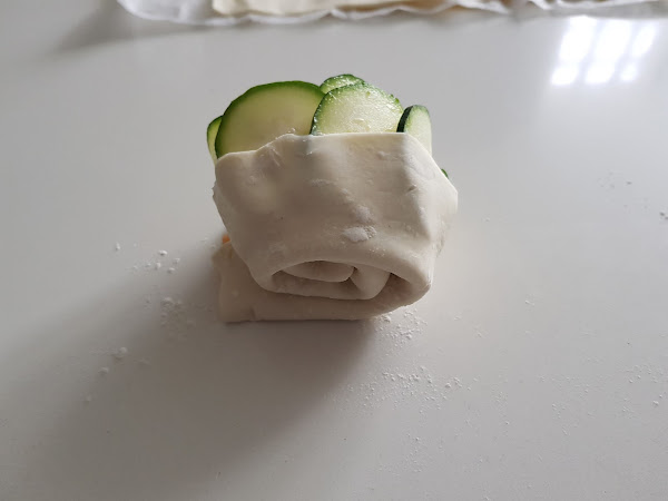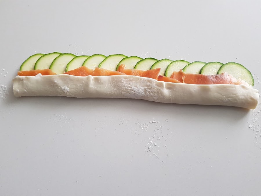 5. - Cortamos tiras de salmón y las colocamos sobre la parte inferior de los calabacines.