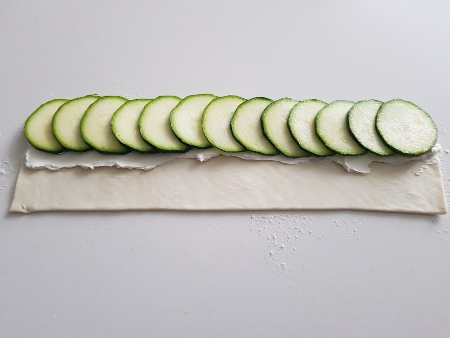 4. - Colocamos los calabacines bien ordenados sobre la parte untada con queso.
