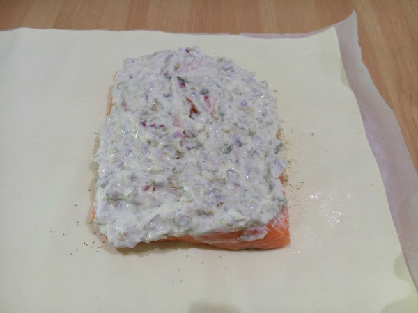 6. Echamos sal, pimienta y eneldo sobre el salmón.