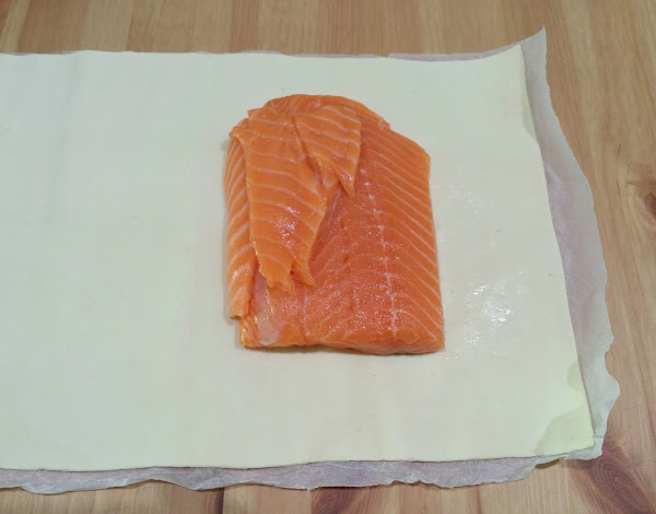 5. Extendemos la lámina de hojaldre sobre la bandeja del horno. Sobre la masa, coloca los trozos de salmón. En mi caso, como era un lomo grande, he cortado la parte más fina y la he puesto por encima. Así conseguimos además que el paquete quede de tamaño más homogéneo.