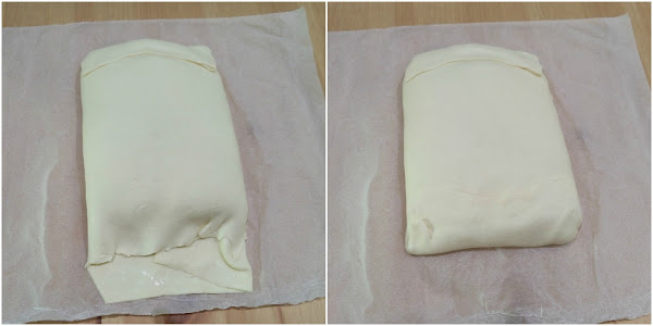 8. Ahora, con cuidado, cerramos el hojaldre haciendo un paquete. Pliega bien los extremos para que al cocinarse no se salgan los jugos. Una buena forma de "pegar" el hojaldre es mojarse un poco el dedo con agua y aplicarlo sobre los pliegues, apretando un poquito.