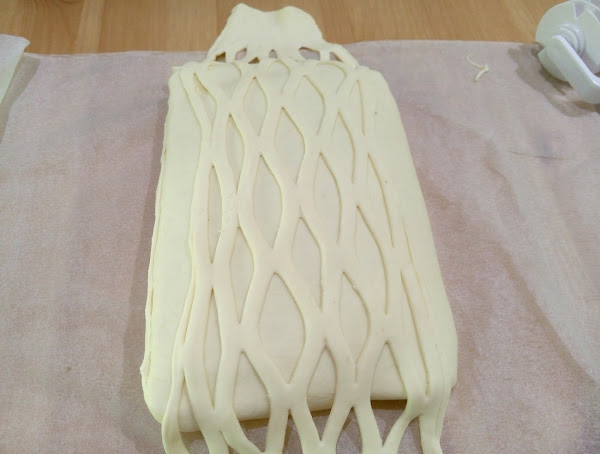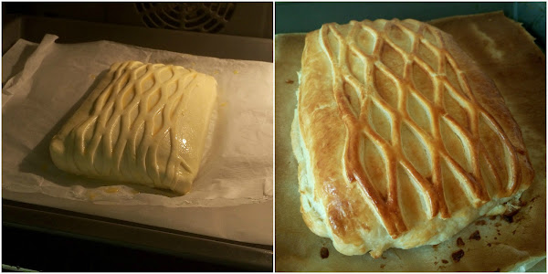 9. Una vez bien cerrado el "paquetito" le damos la vuelta con cuidado de que no se rompa dejando así la parte bonita hacia arriba. Como la lámina de hojaldre quedaba un poco grande, he sacado una tira y la he cortado con forma de rejilla para ponerlo por encima y decorar. Puedes decorar simplemente con unas tiritas de hojaldre o utilizar un cortador de galletas para decorar con alguna forma navideña, flores, hojas, etc.