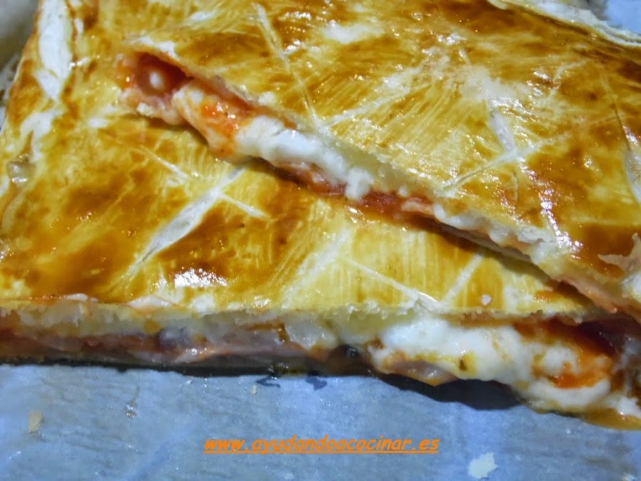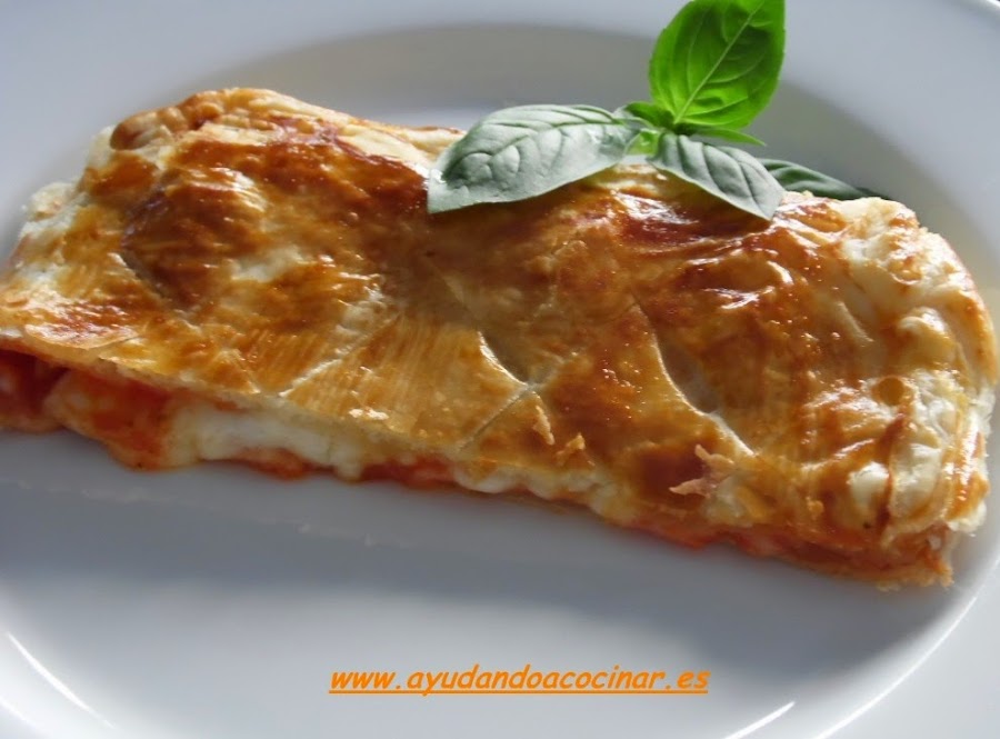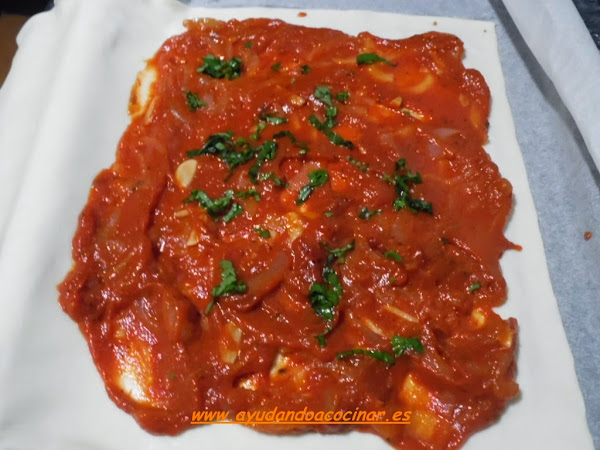 Colocar un papel de horno sobre una bandeja, poner encima la lámina de hojaldre y echar sobre la mitad de ésta la mezcla de tomate y la albahaca fresca picada, dejando la otra mitad de la lámina de hojaldre libre para tapar.