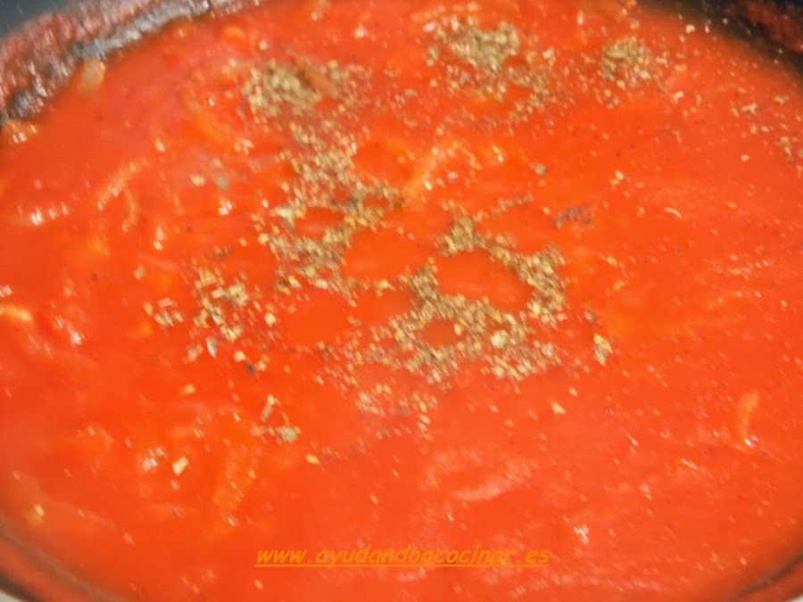 Incorporar el Tomate triturado, el orégano, la pimienta, pizca de sal y la cucharadita de azúcar (ésta es para rectificar la acidez del tomate).