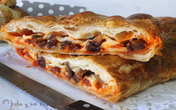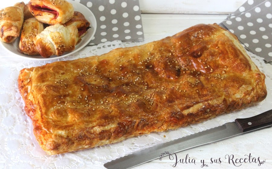 Paseando por la red vi esta empanada de sobrasada, queso y dátiles y como además tenía una lámina de hojaldre y un paquete de dátiles que también estaban cerca de la fecha de consumo, me decidía a hacerla y de paso reciclar todos esos productos que vas dejando aparcados para otra ocasión.