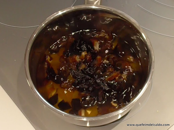 Mientras tanto hacemos la salsa. Ponemos en el cazo el resultante del vino con los frutos secos.