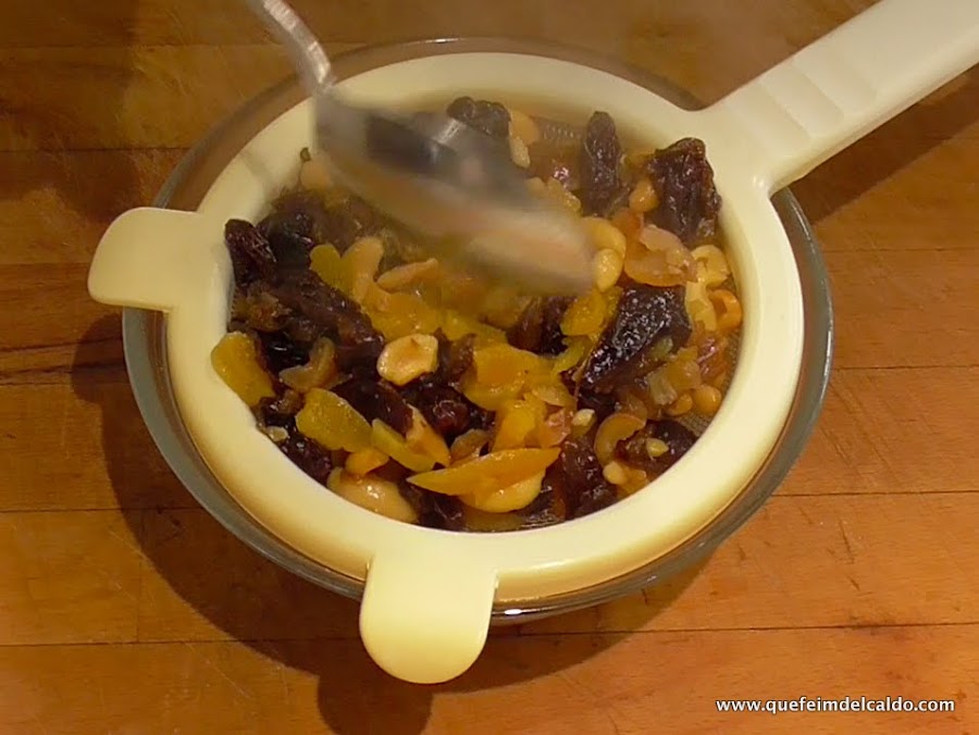 Con la ayuda de un colador colamos los frutos secos y reservamos el vino para hacer la salsa final.