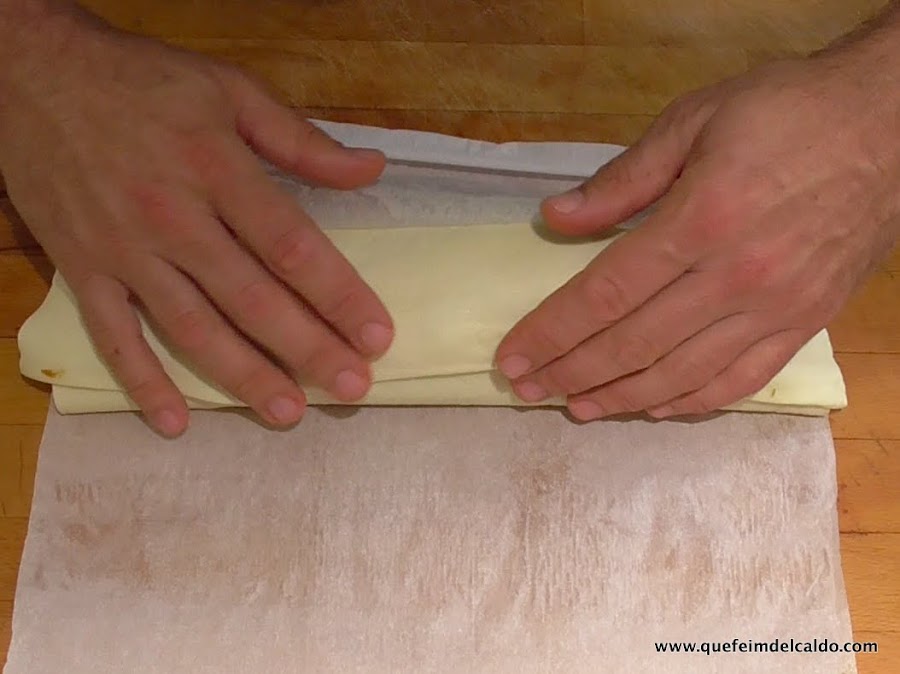 Sobre la salsa colocamos 2 trozos de hojaldre.