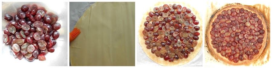 Sacamos el hojaldre de la nevera y mientras se templa lavamos las uvas y las partimos por la mitad para quitarle las semillas. Desenrollamos la lámina de hojaldre y le hacemos una marca en el borde, de 2 cm. de ancho, sin cortar, pintamos el borde con huevo batido, (sólo ese borde que hemos marcado), ponemos las uvas sobre la masa y esparcimos el azúcar moreno por encima.