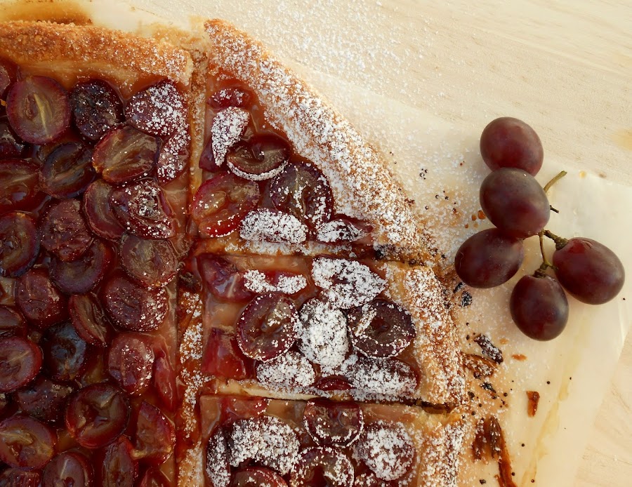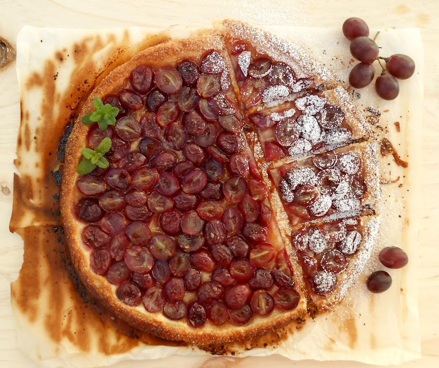 La uva al cocinarse suelta jugo, pero en cuanto se enfría queda meloso por lo que podemos cortar la tarta sin problemas.