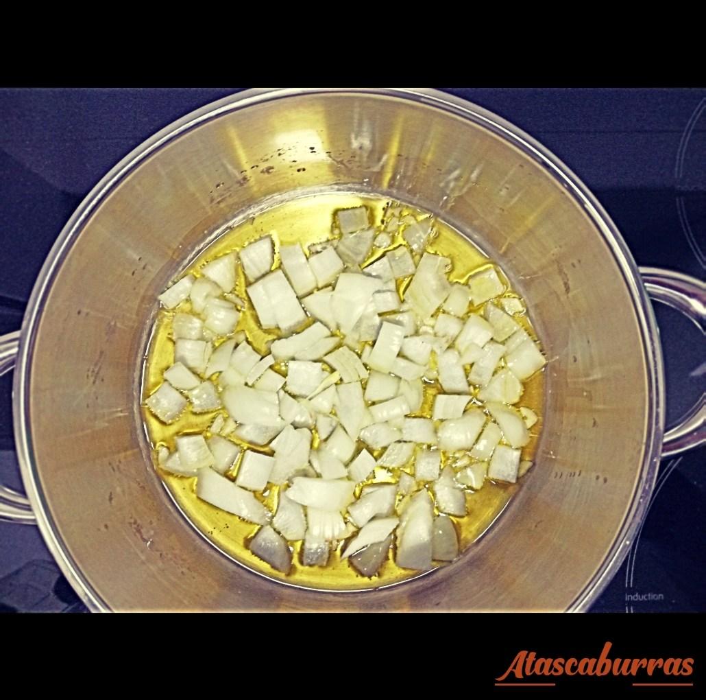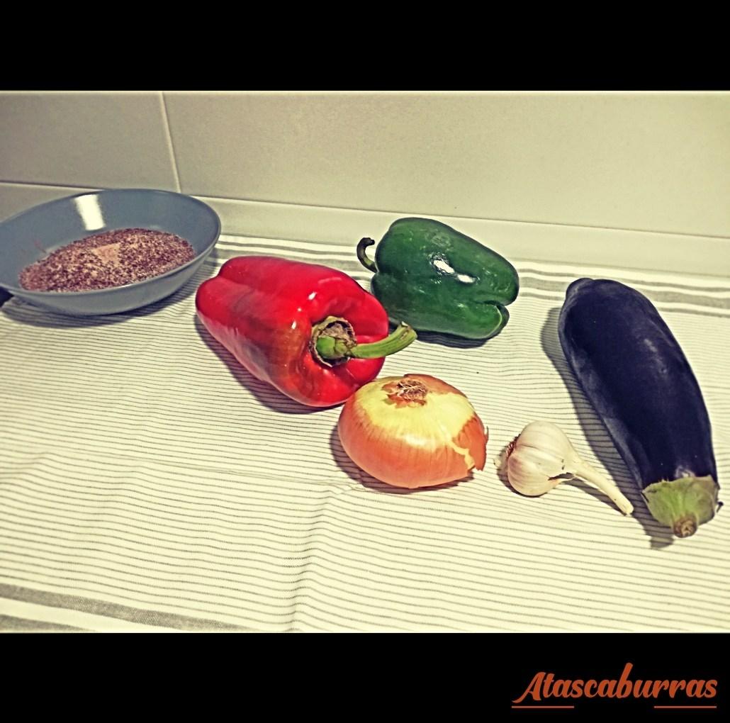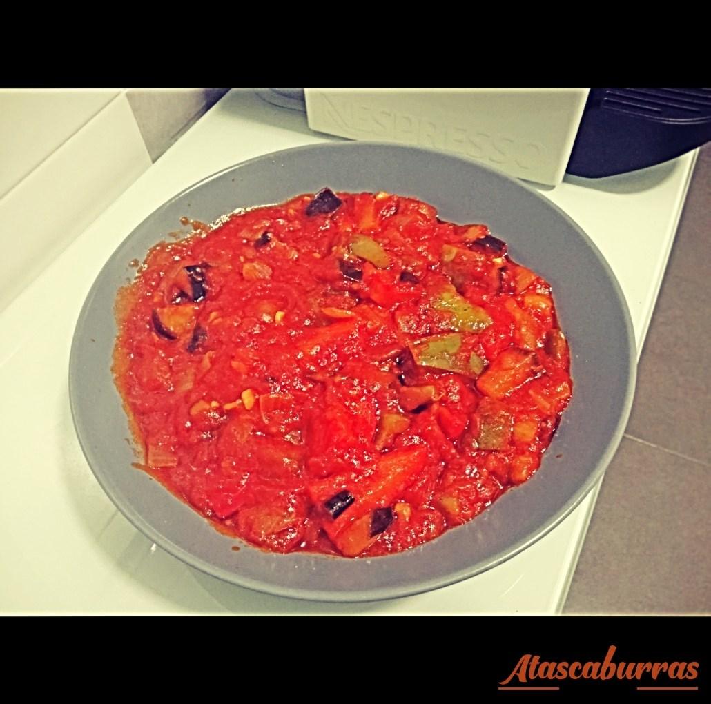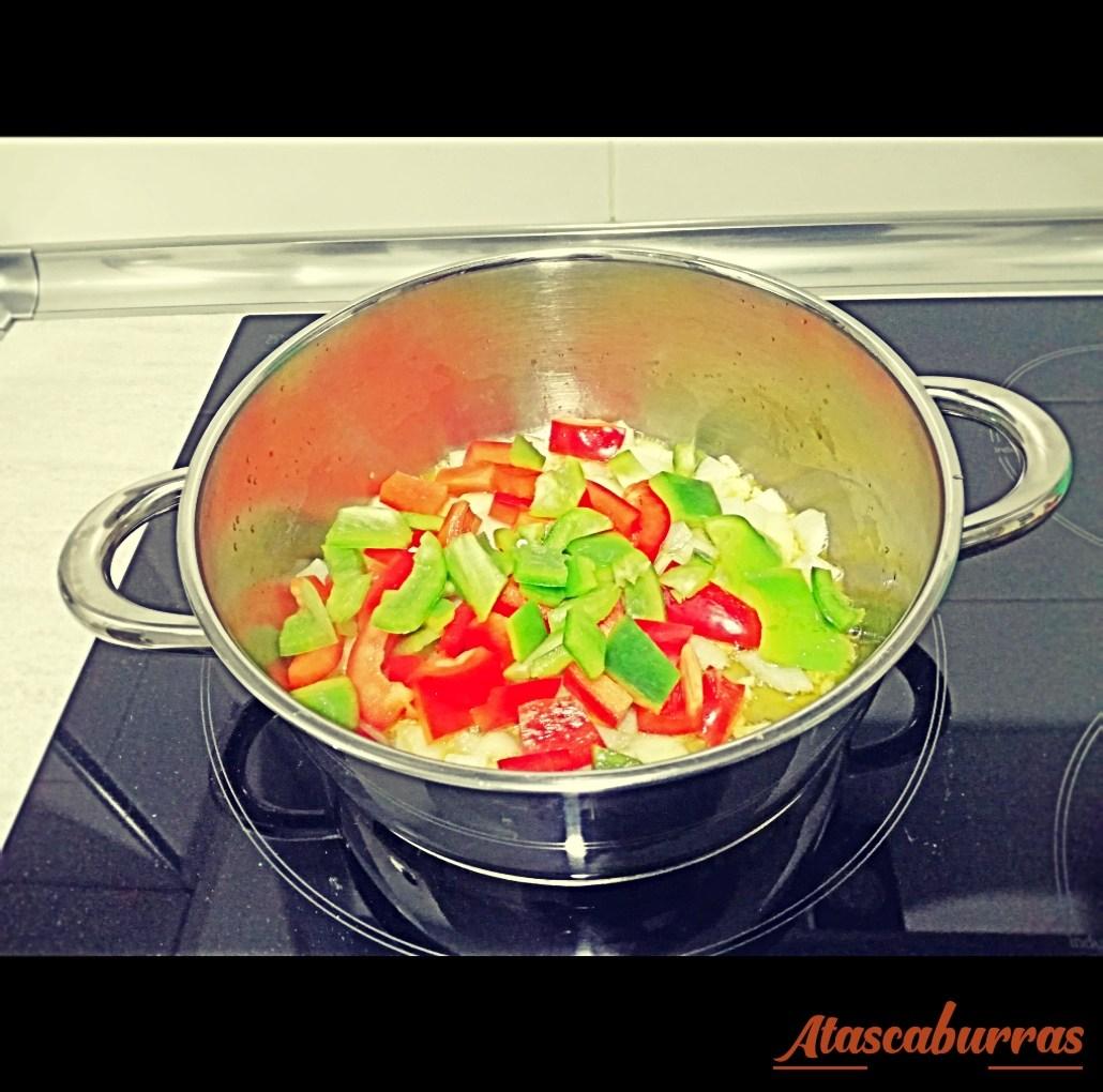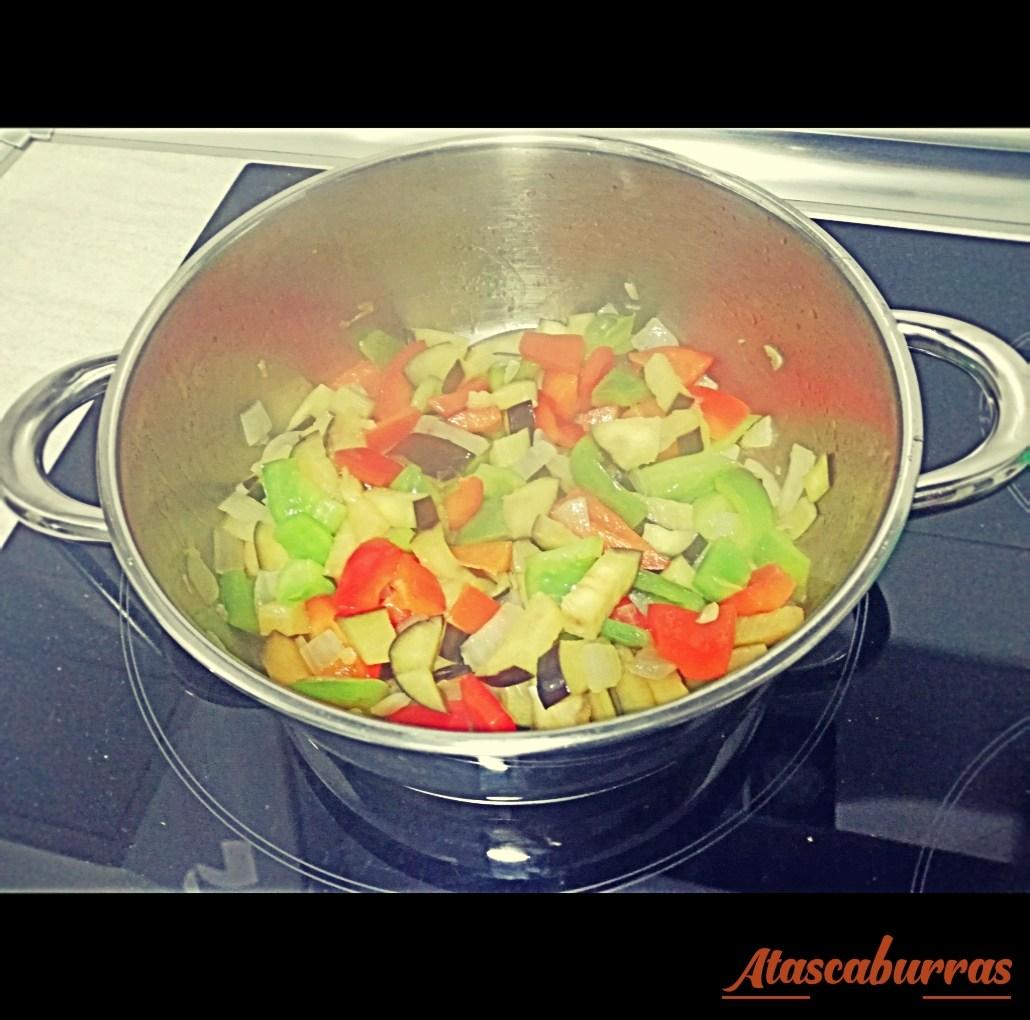 Preparamos el pisto: primero se sofríen los ajos picados, luego cebolla, luego pimientos y por último berenjena. El momento de echar cada ingrediente, es cuando haya cogido color.