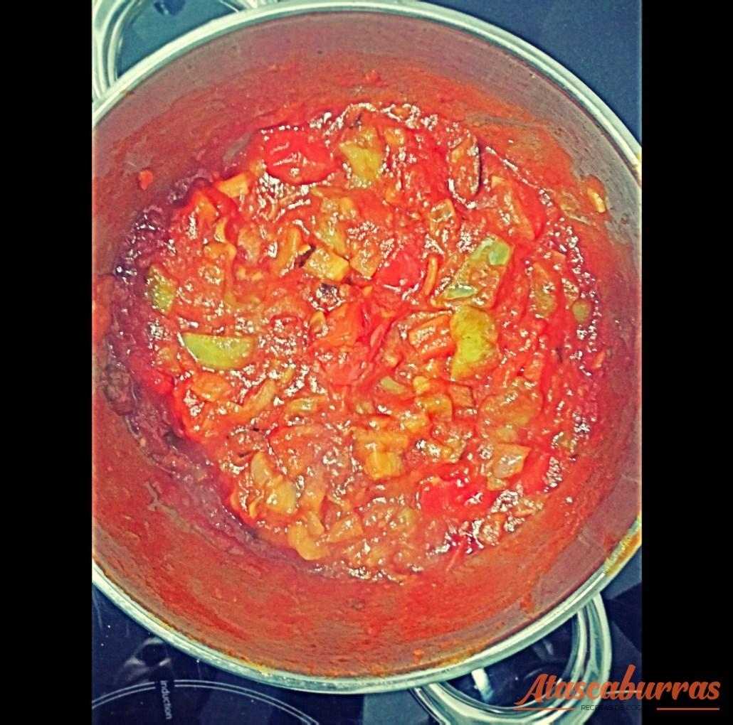 Vertemos el tomate y dejamos hacerse con la tapa durante media hora a fuego suave.