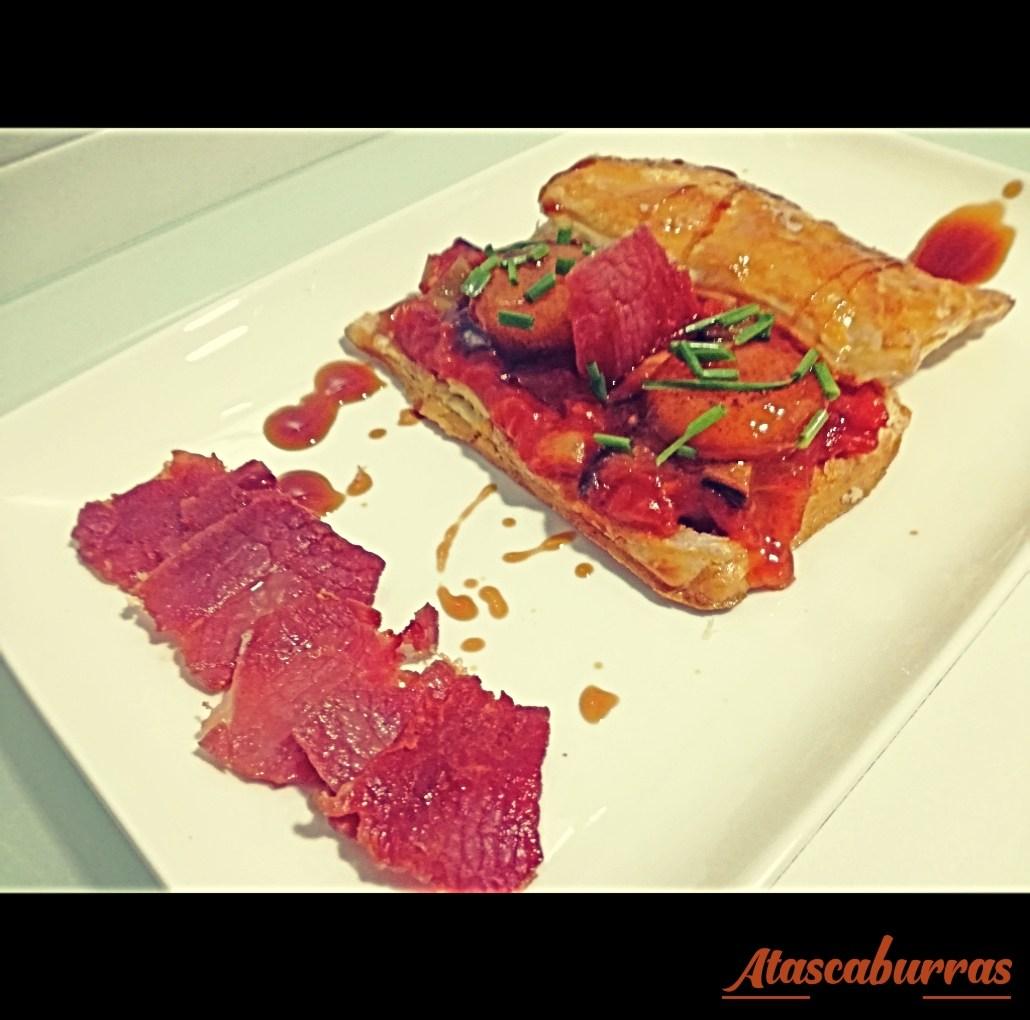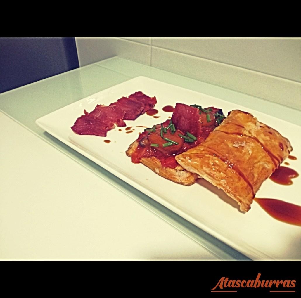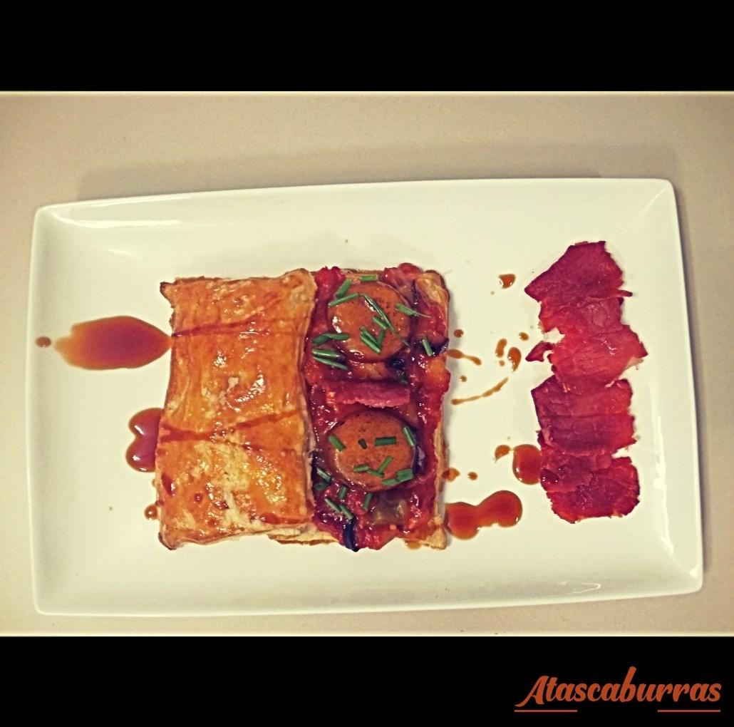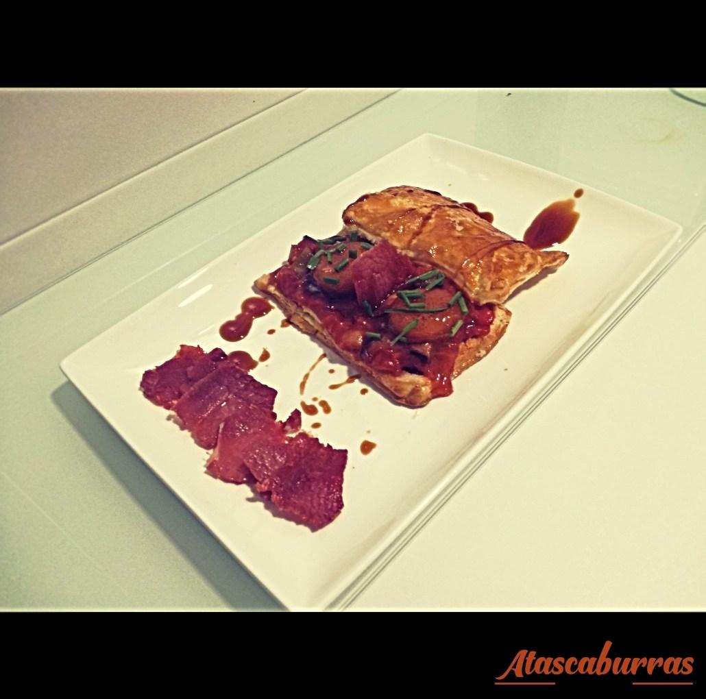 Hojaldre descapotable de pisto manchego y yema de huevo curada, acompañado de crujiente de jamón y reducción de soja y miel
