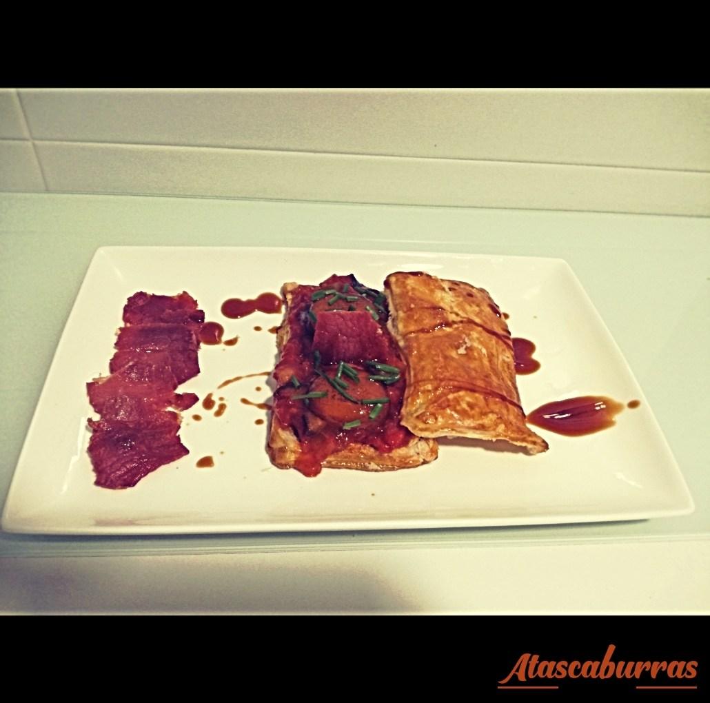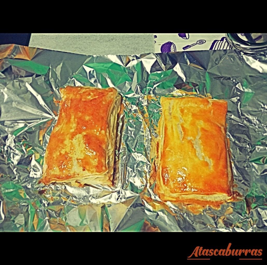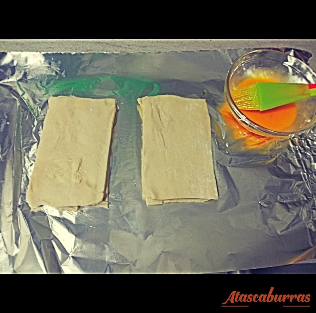 Pintamos con huevo para que coja un buen color y horneamos con el horno ya previamente caliente, hasta que haya subido y se haya dorado el hojaldre