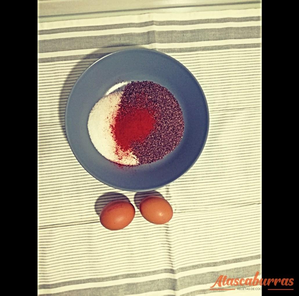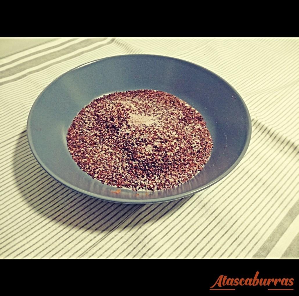Lo primero será juntar la misma cantidad de sal y azúcar. Yo en este caso tenía una sal negra del Himalaya que no me gustaba y le he dado salida. Se mezcla junto pimentón de la Vera.