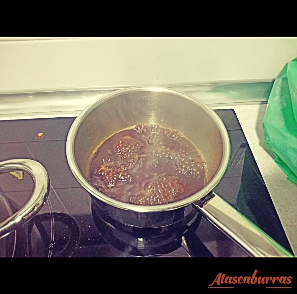 Para la reducción de soja y miel, únicamente es hechar la soja y miel y reducir. Cuando haya reducido un poco le echamos la maicena disuelta en un culín de agua, para que espese más