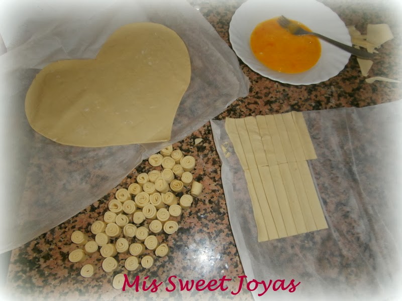 Ya tenemos todas las tiras hechas y enrolladas,ahora pintamos el borde con el huevo batido y ponemos los espirales juntos hasta terminar el contorno del corazón.
