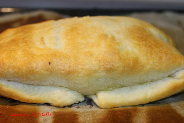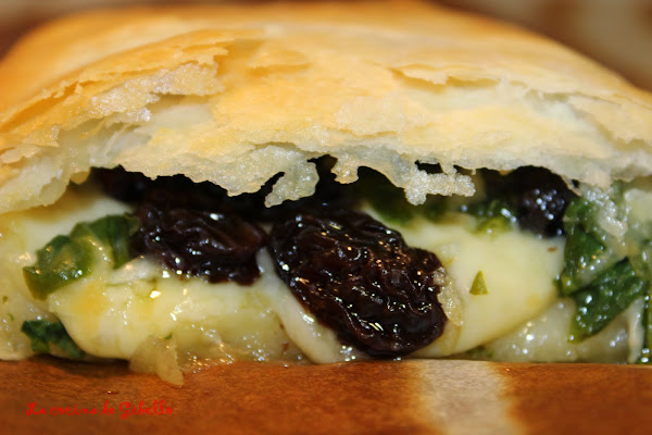 Colocamos primero una base de queso emmental rayado a lo largo de la masa quedando libre tres dedos más o menos por cada lado. Ahora ponemos las acelgas, ajo y pasas encima del queso. Cerramos con la parte que nos queda libre de la masa de hojaldre. Untamos con aceite de oliva o con huevo batido por encima de la masa de hojaldre.